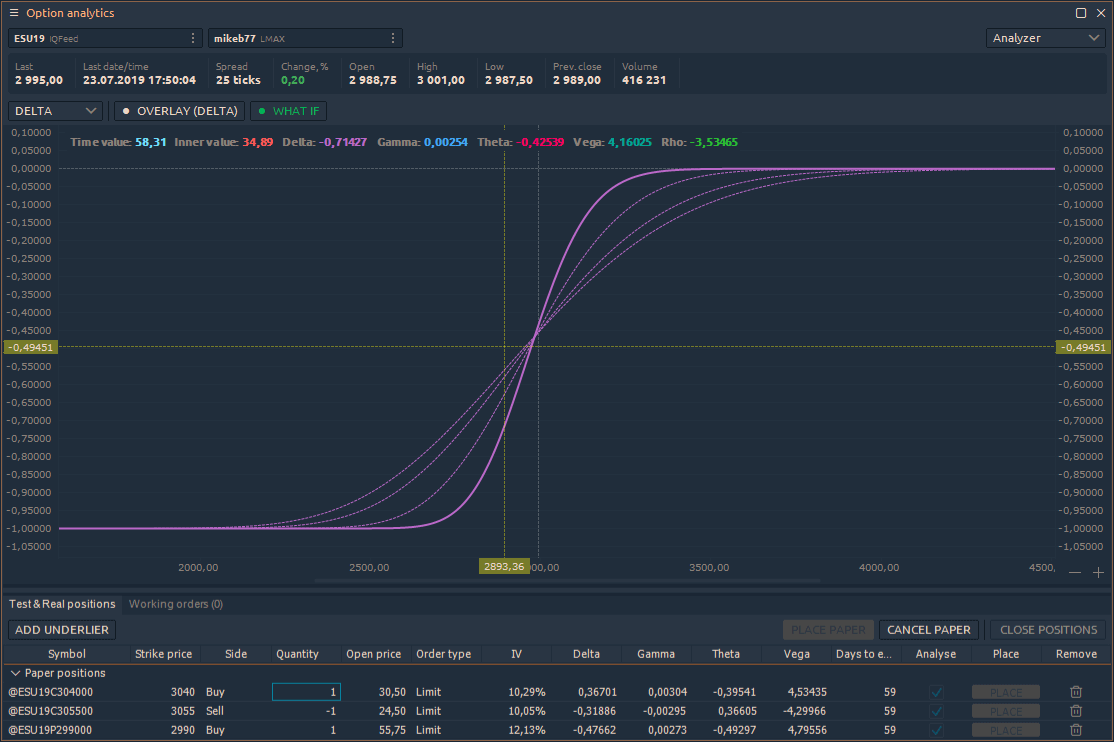 Create and analyze custom, user-defined strategies and submit them to the exchange. Switch between various options “Greeks” risk profiles for advanced analysis